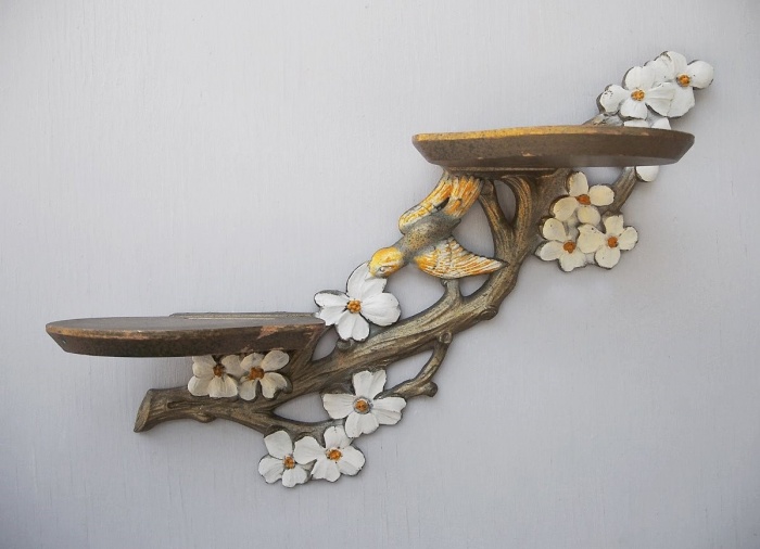 Особую изысканность придает полкам конструкция боковин в ажурном исполнении. С этой целью используются металлические стержни и проволока, изгибаемые с формированием определенного рисунка. Нередко несущие детали изготавливаются из нескольких реек или планки с декоративными выточками.
